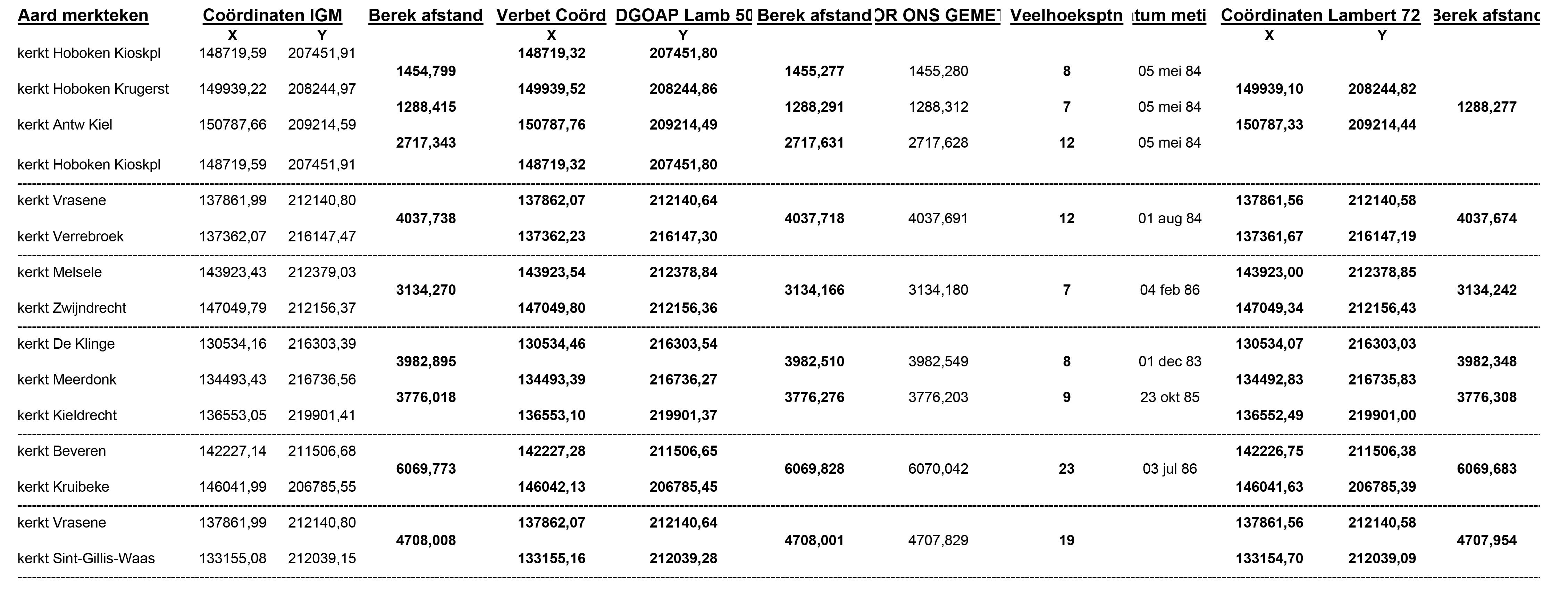 Nota: Ik kan hiermee niet bewijzen dat àlle kerktorens door het Kadaster correct werden verbeterd. Slechts de enkele die ik hier gemeten heb, bewijs ik dat de tussenafstanden werkelijk op millimeters na correct zijn. Hieruit kan ook niet worden besloten dat àlle grondpunten door het Kadaster vastgesteld correct zijn, dit zal veelal afhangen van de apparatuur en de ingesteldheid van de meetploeg. Eenzelfde opmerking maak ik ook voor het IGM, of om het even welk privaat bureel.